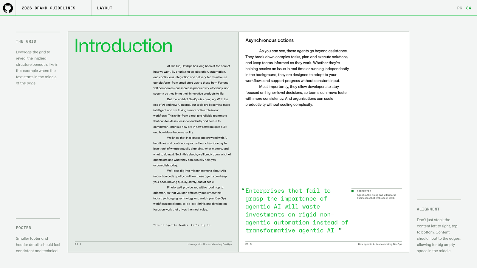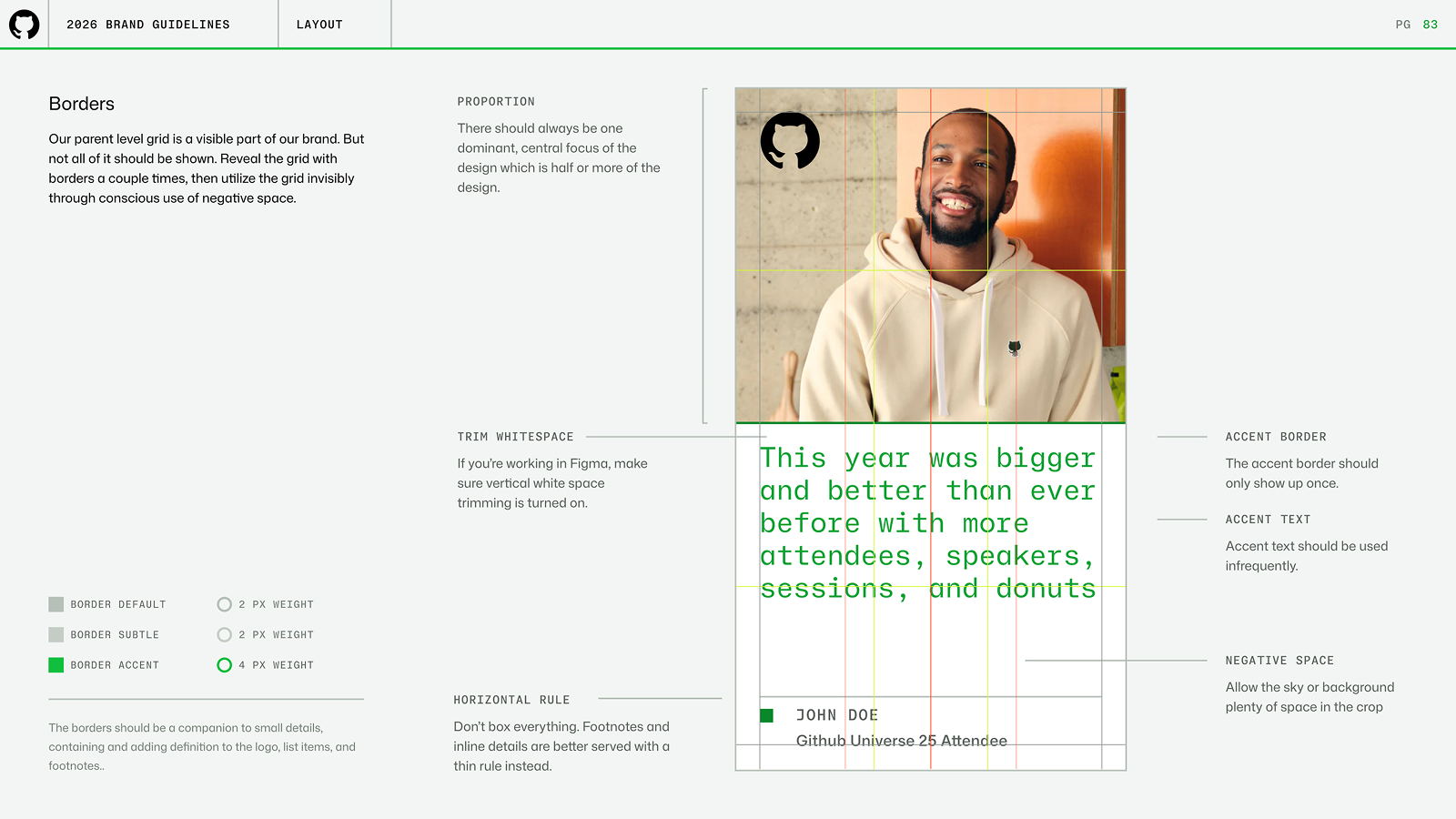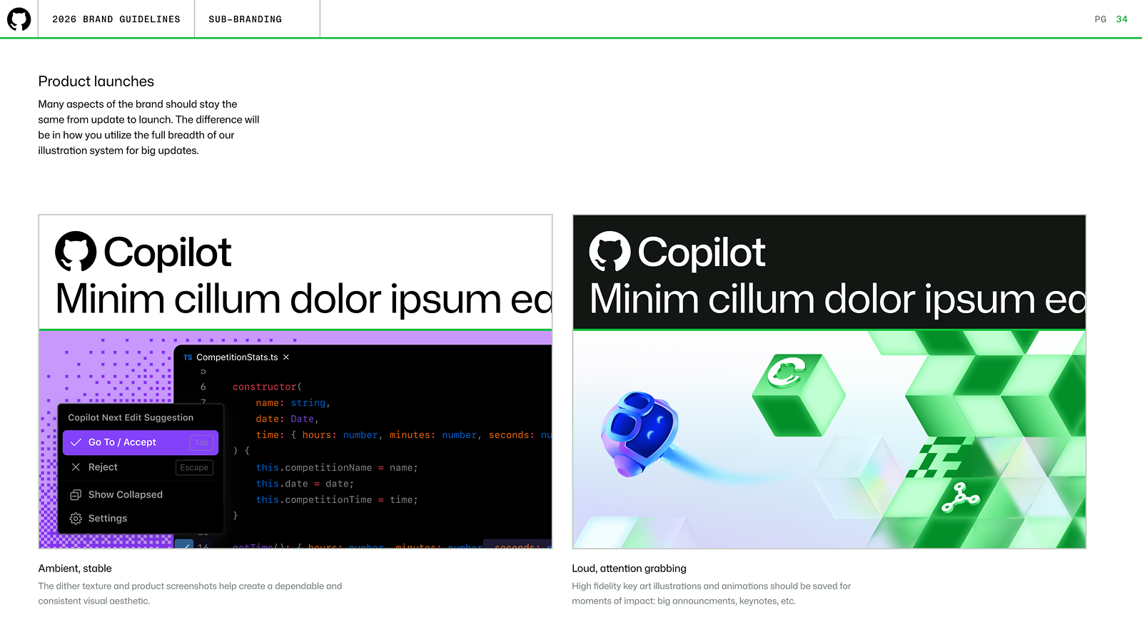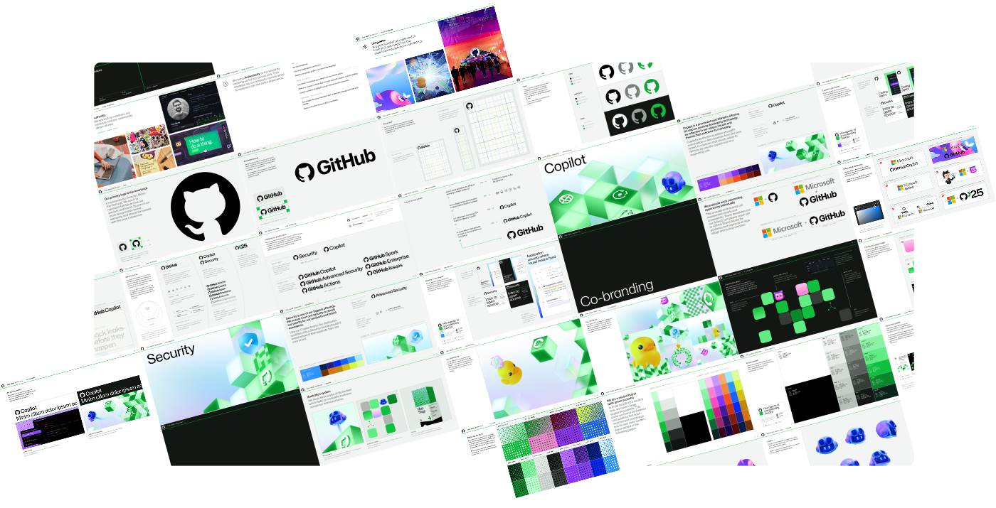 The layout system split visuals into clean halfs or thirds. Each side represented the two parts of GitHub's offering: creative, infrastructure. The layout side was legible, grided, seperate. The illustration side was creative, dimensional, expressive.